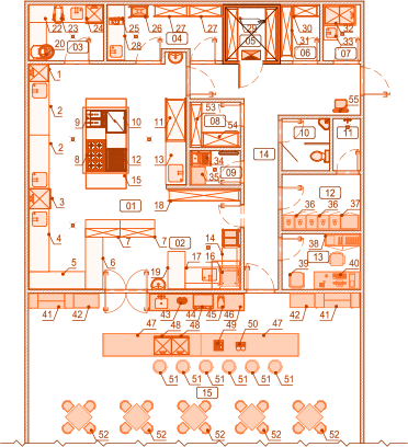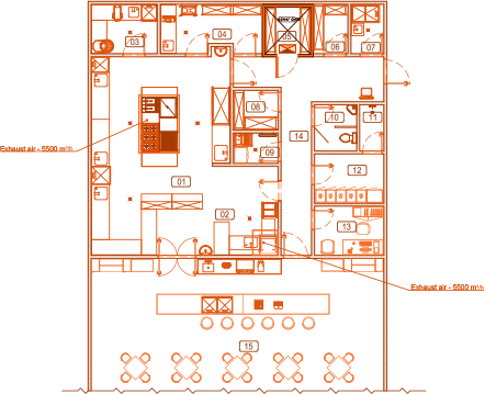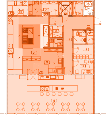 Põhitootmisruumi tsoneerimine - optimaalne jaotamine tsoonideks üksikute toimingute jaoks: poolfabrikaatide valmistamine, kuumtöötlemine, seadmete ja nõude pesemine, roogade serveerimine ja t.t.